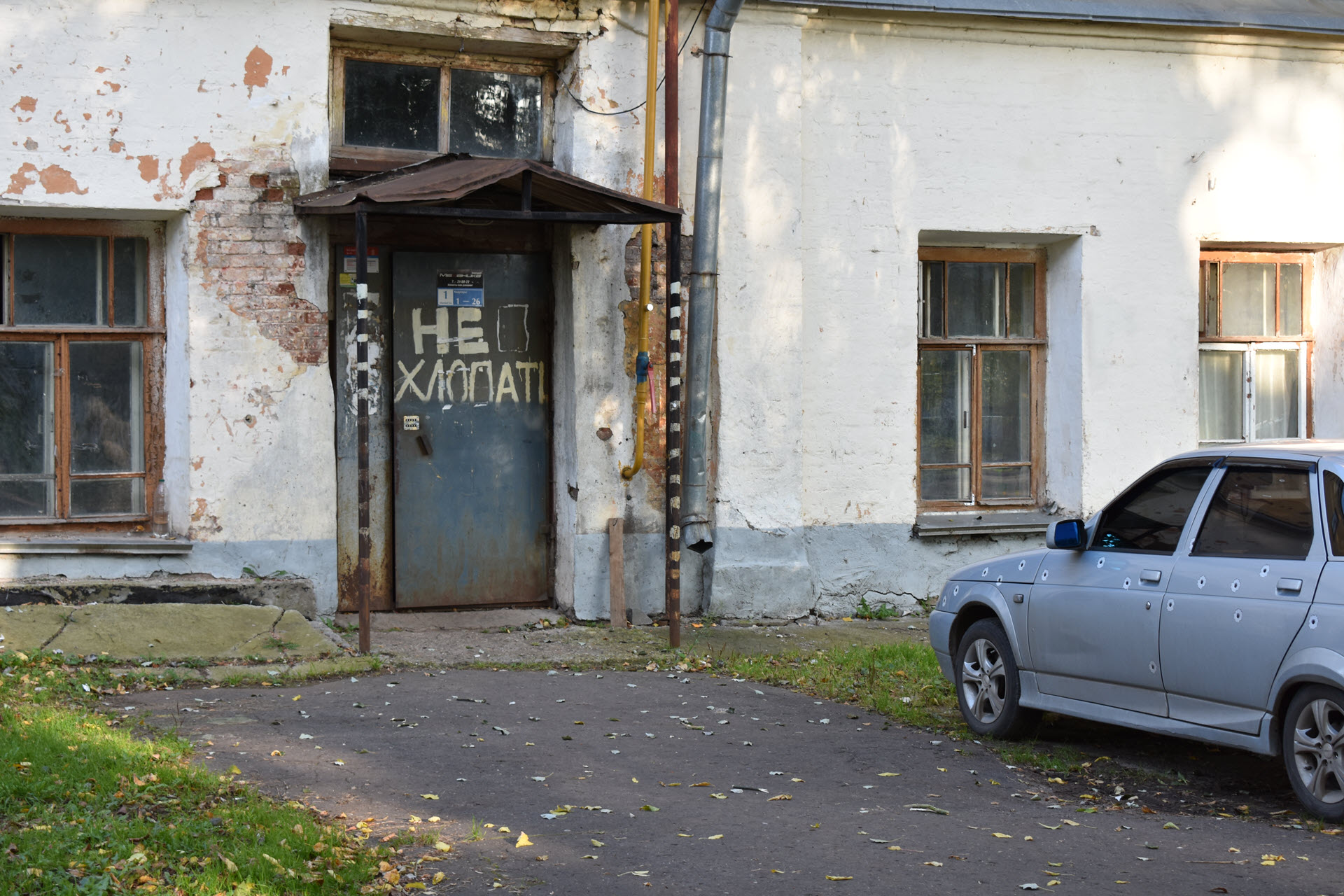 Внутрь крайне осторожно, чтобы от хлопка двери стена не осыпалась. И вообще опасно. Вон, машинке уже досталось.